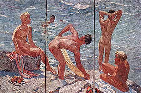 Однако, понимая все достоинства мозаики как материала монументальной живописи необычайного по силе своего воздействия на зрителя и после войны Дейнека продолжает в мозаике свою любимую оптимистическую тему: силы, здоровья, динамики, молодости и радости жизни. В основном он работает в станковой мозаике.